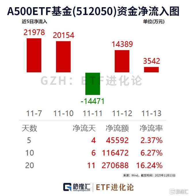 A500ETF基金(512050)本周小幅回撤1.02%,但本周前四日合计净流入2.36亿元,近20日“吸金”27.07亿元。