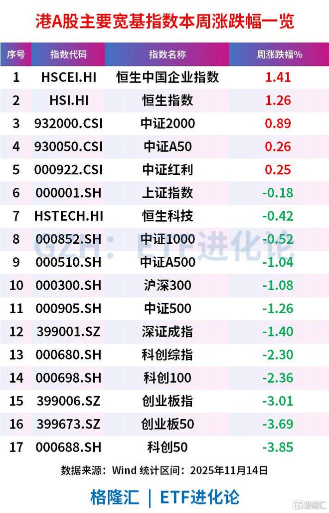 全周表现来看,恒生中国企业指数、恒生全周分别涨1.4%和1.26%。上证指数本周微跌0.18%,沪深300和中证A500分别跌1.08%和1.04%,成长含量较高的科创板50、创业板指领跌,全周分别跌3.8%、3%。
