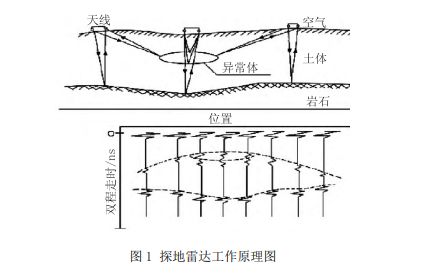 天线发射器将宽频带短脉冲电磁波(10^6~10^9Hz)发送至地下,经目标体或电性界面反射后由雷达天线器接收,并以电磁反射波时域曲线形式成像。因地下空洞、裂缝、管线等与周围介质存在介电常数差异,可以形成良好的反射界面,同时电磁波在反射界面形上还可继续向下透射,在下一界面形成反射并被地面仪器接收,以此形成多层反射波时间域记录。通过对所接收的雷达信号进行处理和图像解译,达到探测异常的目的[6]。当已知地层中波速υ0或介质的相对介电常数εγ 时,读取雷达剖面上双程走时t ,便可计算目标体深度 h=υ0t/2=ct/( 2√εγ),式中c为电磁波在线m/ns)。工作原理如图1所示。